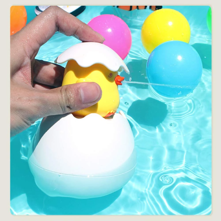 Floats in water to make bath-time or pool time more fun. Press the duck's egg into water, the duck's head will rise slowly from the egg. Take it out of water, it'll rain and become a sprinkler.
