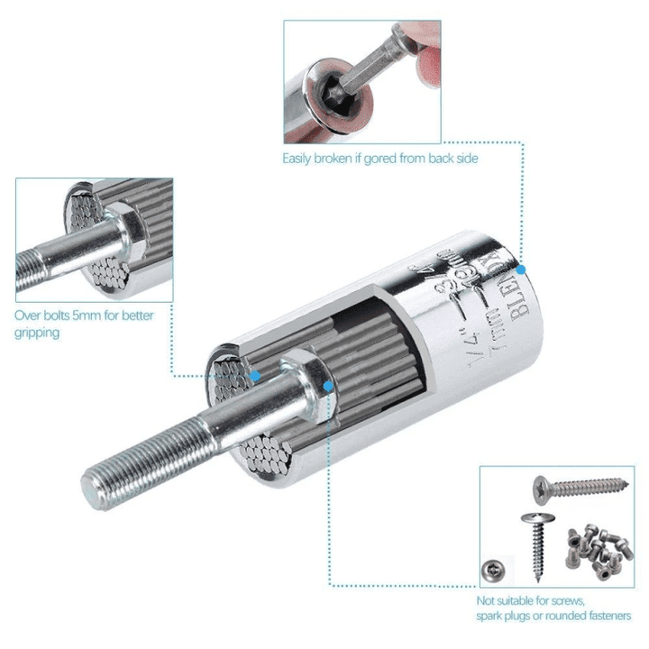 The unique design ensures that the Magic Grip automatically adjusts to any size or shape, compact and lightweight design makes it easy to carry around. Suitable for standard ¼ to ¾ inches and 7mm to 19mm screws with no more than 450 NM torque, meeting all your needs.